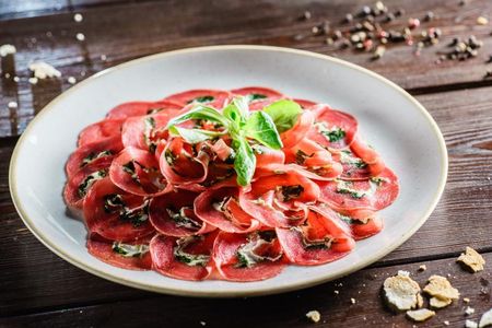 В 1950 году в Венеции проходила выставка другого живописца эпохи Возрождения –– Витторе Карпаччо. В честь него Чиприани назвал блюдо из тонко нарезанных кусочков сырой говядины, приправленных оливковым маслом и лимонным соком. Шеф-повар впервые приготовил его для графини Амалии Нани Мочениго, которой врачи запретили есть жареное, тушеное и вареное мясо.