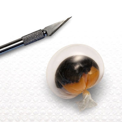 Икра с яйцом-пашот в пластиковом пузыре. Вместе с блюдом подается скальпель.