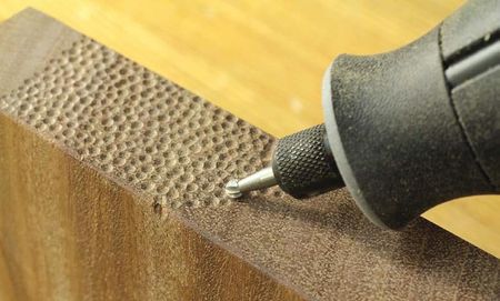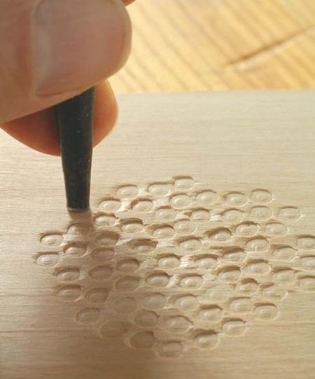 Выше описанная текстура на поверхности дерева может образоваться также при помощи гвоздя с закругленной шляпкой. Переворачиваем его просто вверх острием и одиночными ударами молотка создаем углубления. Гвоздь также можно зажать в дрель, тогда можно обойтись без молотка.