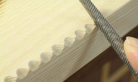 При помощи круглого рашпиля стачиваем углы так, что бы получились углубления с одинаковой глубиной и расстоянием. При желании можно изменить угол обработки, что поможет несколько разнообразить окончательный рисунок обрабатываемой заготовки.