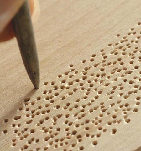 Слегка надавливая обычным шилом, на деревянную поверхность, создаем на ней множество мелких углублений. Текстура и цвет обработанной поверхности древесины, надо сказать, не всегда постоянны. Со временем цвет дерева меняется, так поверхность дуба и красного дерева темнеет, палисандра чернеет, березы желтеет и т. д. Цвет также меняется и под слоем нанесенного на поверхность лака. Древесина приобретает более темный оттенок. При этом у разных пород оттенок также будет отличаться. Что же касается цвета текстуры, то под слоем лака он, как правило, становится ярче, как-бы проявляется. Если необходимо определить какой оттенок приобретет поверхность древесины покрытой лаком, достаточно слегка смочить ее водой.