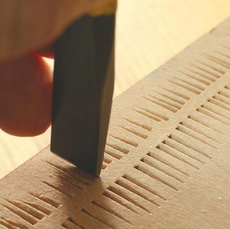 Применив угловую стамеску для обработки деревянной поверхности можно создать множество срезов различной длины и глубины, расположенных недалеко друг от друга.