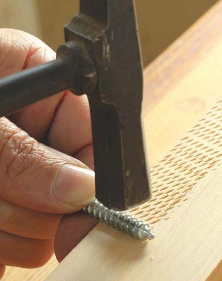 Достаточно толстым оцинкованным шурупом и молотком создаем на деревянной поверхности множество одинаковых бороздок. Пользоваться для этого метода необходимо именно оцинкованным шурупом, так как шурупы без покрытия будут окрашивать в черный цвет дерево.
