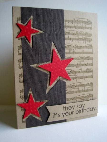Открытка для мужчины своими руками, индивидуальное поздравление с днем рождения, украшенная на фоне нот звездочками.