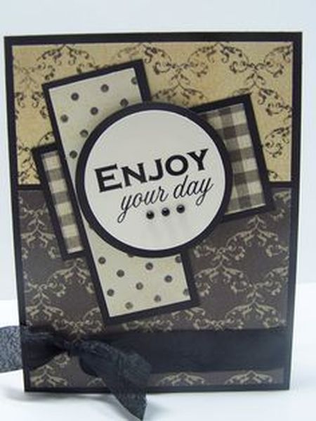 Простая, но стильная поздравительная открытка для мужчины своими руками в темных тонах с серебристыми заклепками и прямыми линиями.