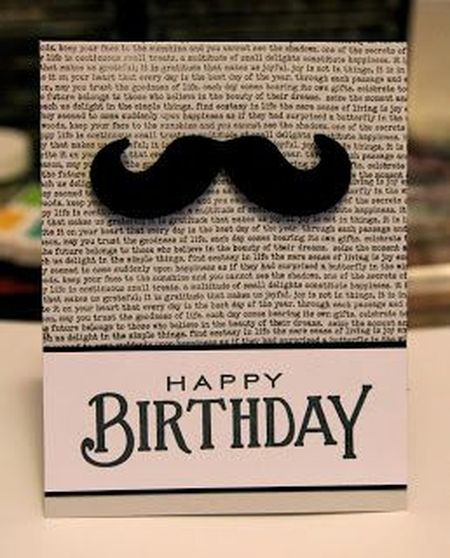 Стильная открытка, индивидуальное поздравление с днем рождения для мужчины своими руками украшенная усами. Как же без усов.