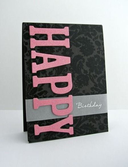 А эта открытка для мужчины своими руками индивидуальное поздравление с днем рождения с вензелями на черном фоне и розовыми буквами.