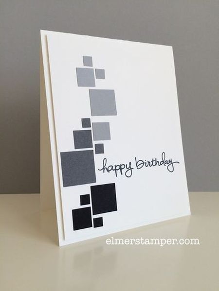 Открытка для мужчины своими руками индивидуальное поздравление с днем рождения с разного размера темными квадратами на белом фоне.