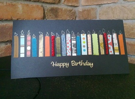 Оригинальная черная открытка с разноцветными свечами из ткани. Такую можно делать вместе с ребенком.