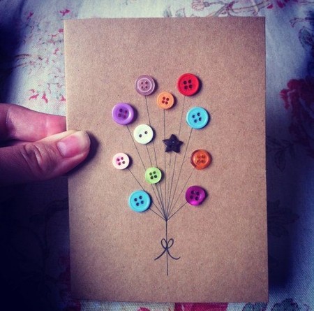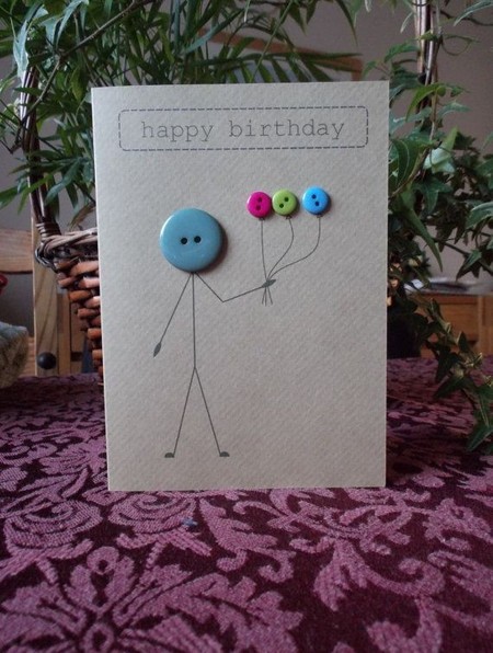 Милая и оригинальная открытка из обычных пуговиц! Получился настоящий человечек, который несет шары из маленьких пуговок!