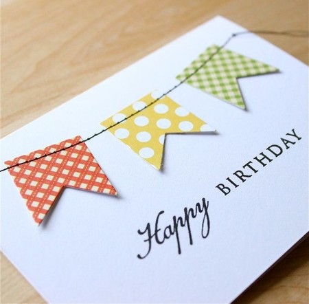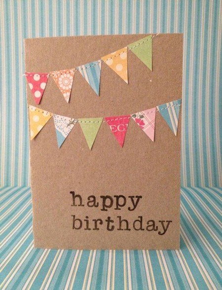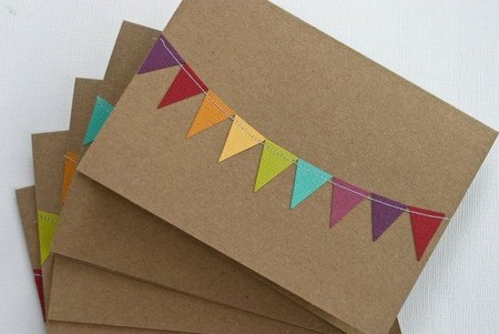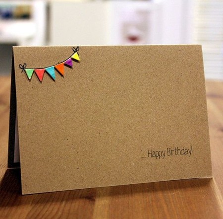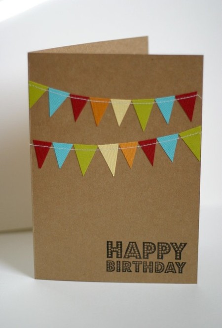 Веселая и простая открытка на крафтовом картоне с разноцветными флажками.
