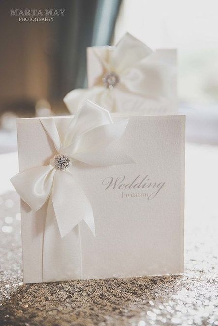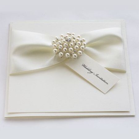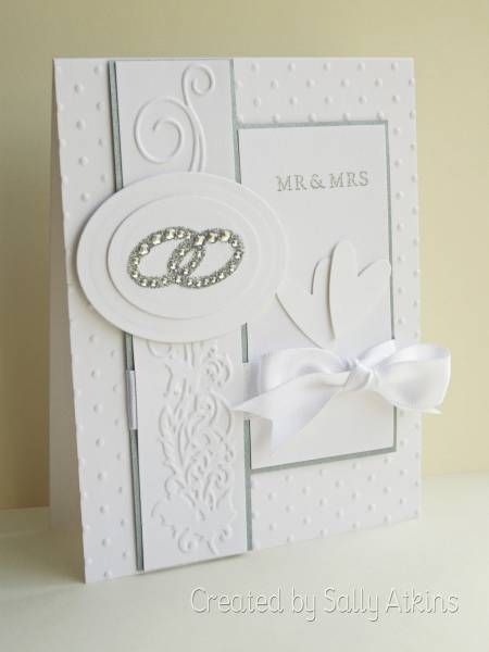 Простая свадебная открытка белого цвета своими руками со стразами и бантом.