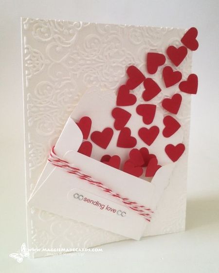 Одна из 50 идей свадебных открыток своими руками серого цвета своими руками, оформленная сердечками и красной лентой на фоне объемного декора.