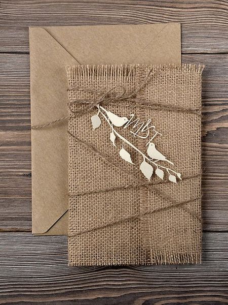 Свадебная открытка, перевязанная грубой ниткой, своими руками оформленная сердечками на белой бумаге.