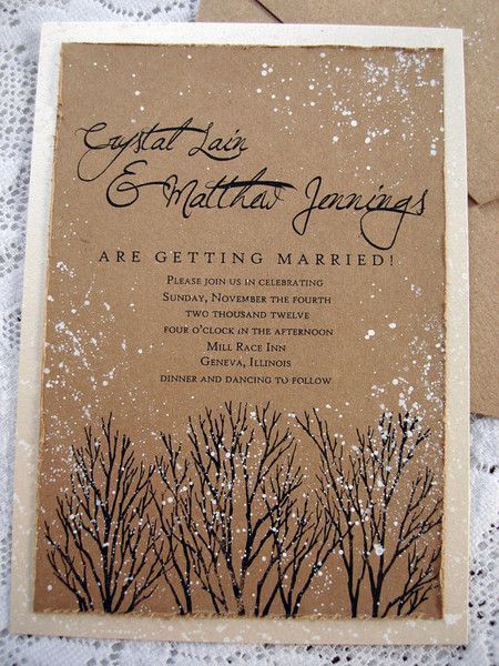 Свадебная открытка на крафтовой бумаге своими руками с припорошенными снегом ветвями деревьев (серия 50 идей свадебных открыток) .