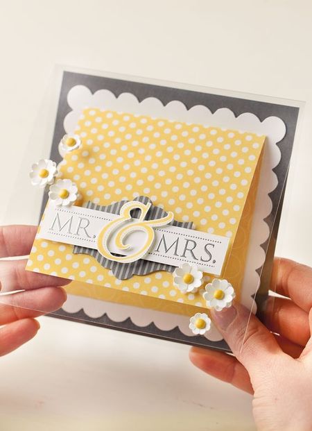 Один из вариантов открытки с оформлением цветами своими руками в горошек на желтой бумаге.