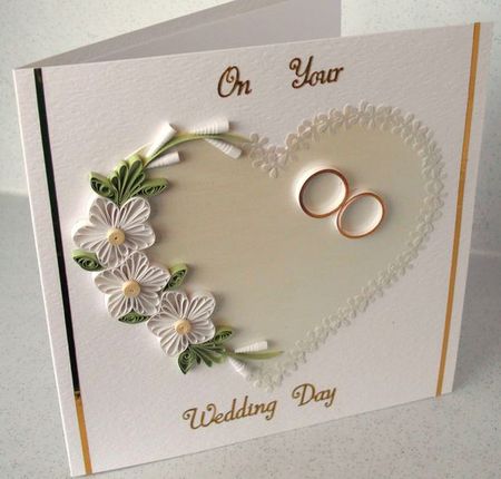 Идея свадебной открытки из объемной бумаги своими руками оформленная бусинами и сердечками.
