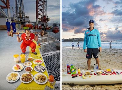 Освальдо Гутьеррез, рабочий нефтяной вышки в Венесуэле (слева). Ему 52 года, рост 1,7 м, вес 99 кг. Его дневной рацион составляет 6000 ккал. Во время своей смены, когда есть время, он бегает на пробежку на вертолетной площадке, практикует карате и поднимает штангу. Брюс Хопкинс — спасатель на пляже Бонди-Бич, Сидней, Австралия (справа). Ему 35 лет, рост 1,83 м, вес 81 кг. Калорийность еды на день 3700 ккал. Хопкинс ест скромно, воздерживается от фаст-фуда и редко пьет алкоголь.