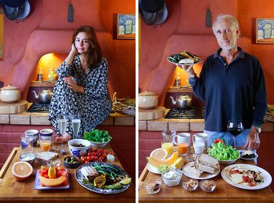 А вот что ест автор этих фотографий и его помощница. Фейт Д’Алуисио, журналист и соавтор книги (слева). Ей 52 года, рост 1,73 м, вес 61 кг. Дневной рацион 1500 ккал. Фотограф Питер Мензель (справа). Ему 61 год, рост 1,85 м, вес 76 кг. Калорийность дневного рациона — 2800 ккал. Молодцы, что сказать! Мы бы и сами не отказались от такого меню.