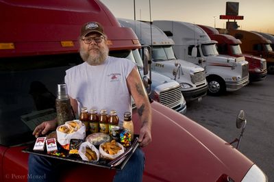 Американский дальнобойщик из Иллинойса Конрад Толби. Ему 54 года, рост 1,87 м, вес 117 кг. Его дневной рацион составляет 5400 ккал. Питается он всегда одинаково — фаст-фудом в придорожных кафешках. Конраду не помешало бы подумать о диете, он пережил уже два сердечных приступа прямо за рулем.