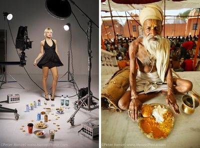 Американский фотограф Питер Мензель путешествует по миру и изучает, что едят самые обычные люди по всему миру — от йога до фотомодели. Фотографии с жителями разных стран он собрал в книгу «Что я ем: вокруг света за 80 обедов». Листая книгу, просто диву даешься, как непохожи люди друг на друга и насколько разную жизнь они ведут. Отпечаток на их рацион накладывают профессия и привычки, культура и обычаи, и, конечно же, уровень жизни. Чего стоит хотя бы разница в калорийности еды: от 800 ккал до 12,3 тыс. ккал в день.
