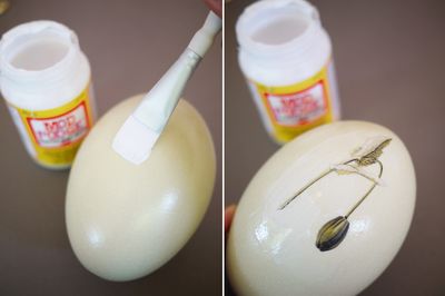 - смазываем яйцо клеем, приклеиваем фрагмент и сверху еще раз проходим клеем