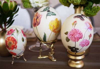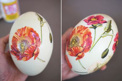 Сделать такие цветочные пасхальные яйца просто и достаточно быстро, если у вас есть цветной принтер и матовый клей для декупажа Mod Podge. Кстати, Мод Подж можно сделать своими руками, в домашних условиях, нужно развести лак с клеем ПВА.