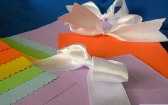 После этого заполняем свободное пространство открытки. Здесь окажутся, кстати разноцветные шелковые ленточки. Из них можно сделать маленькие красивые бантики, которые приклеиваются на открытку.
