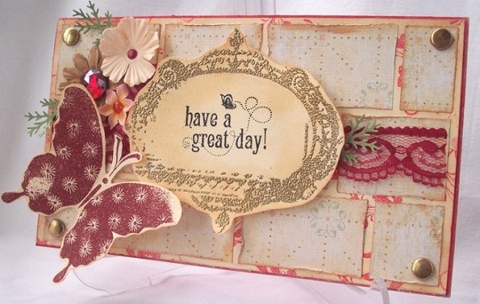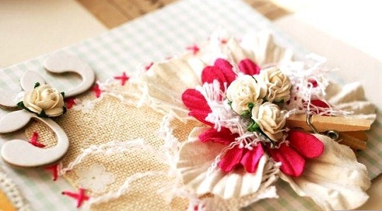 Цвет подбираем такой, который определяется, как основной для всей композиции. После этого обклеиваем цветной бумагой лицевую сторону открытки или для придания элегантности обтягиваем тонкой тканью и прострачиваем на машинке. После такой операции открытка очень будет отличаться от стандартных вариантов.