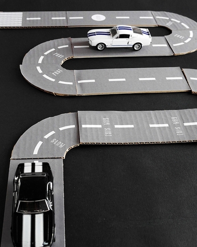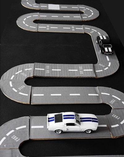 А теперь разложите дорогу на полу и играйте в свое удовольствие. Вдоль дороги можно поставить деревья, домики и прочие развлекательные и дополняющие моменты. Вот и все, детская игрушечная дорога своими руками готова! Уверена играть в нее понравится не только детям, но и взрослым. Отдыхайте и наслаждайтесь!