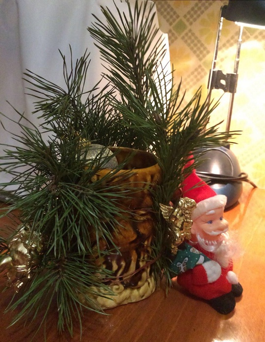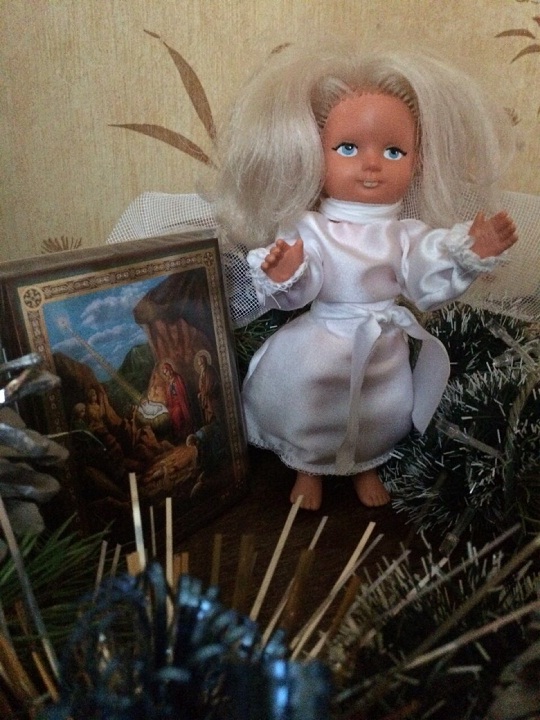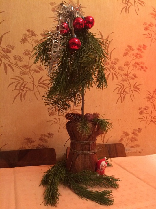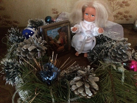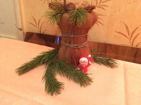 Это пример того, как можно использовать для новогодних украшений, практически все, что можно найти дома. Например, это может быть любимая с детства кукла, если обновить для нее наряд и составить соответствующую новогоднюю композицию. В дело пойдут также и оставшиеся ветки от елки, елочные гирлянды, шары, шишки и другие предметы.