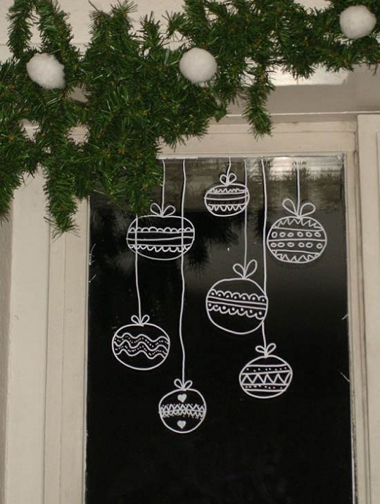 Рисуйте все, что угодно, дайте волю своей фантазии: засыпанный снегом городок, еловые ветки, шары, подарки, снеговиков. Белый цвет выглядит выигрышно, подойдут и другие цвета. Воспользуйтесь небольшим практическим советом: нарисуйте для начала эскиз. Этот новогодний декор имеет одно преимущество, которое заключается в том, что все творчество на окнах можно легко смыть обычной водой, и можно приступить снова.