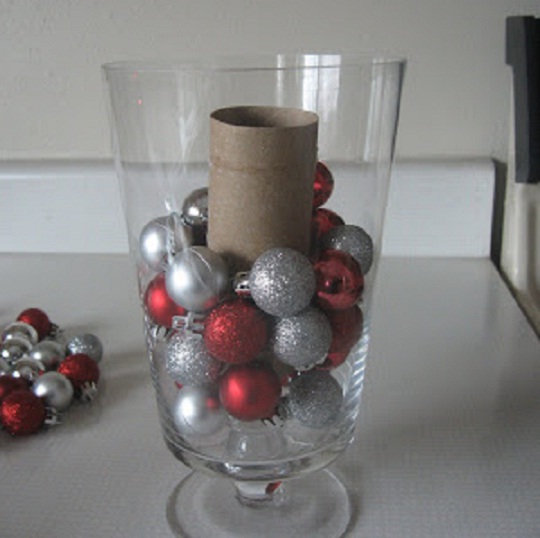 Очень модно в последнее время стало наполнять елочными шарами вазы, бокалы и банки с крышками. Такое оформление хорошо выглядит на стеллаже, столе, прекрасно заменяет букеты. Маленький лайфак: чтобы уменьшить количество шаров, поместите в центр емкости картонный цилиндр.