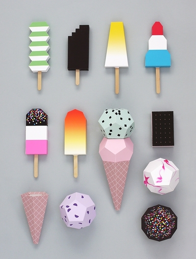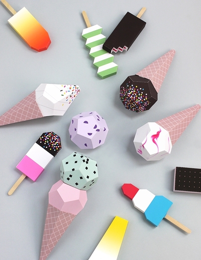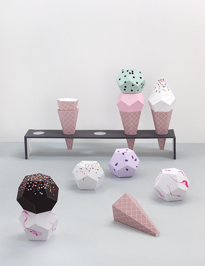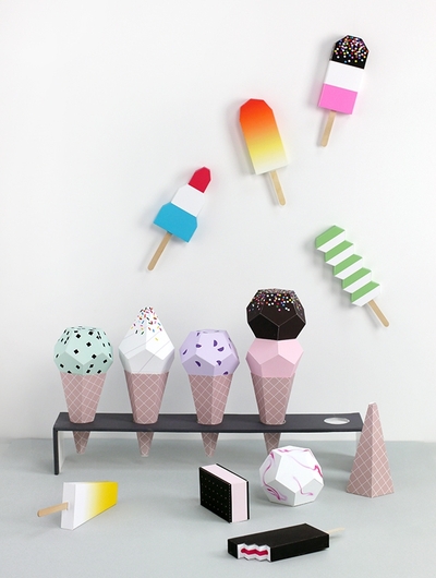 Для начала необходимо скачать шаблоны для мороженого своими руками, после чего печатаем их и вырезаем. Вырезанные заготовки складываем по линиям сгиба и разрезаем все детали по линиям реза, а затем все склеиваем.