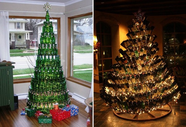 На такое отважится не каждый, но думаю, это стоит того. Уверена, гости ваш креатив точно оценят :-) Вот такие елочки из бутылок будут главным украшением вашего праздника. Самое главное, установите их подальше от прохода, чтобы обезопасить себя и гостей.