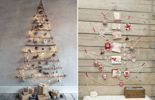 Такая елочка подойдет для тех у кого мало места в квартире или если вы никак не можете себе позволить установить елку, например, если дома детки или домашние животные. Такой способ очень оригинальный и простой. Для этого понадобится гирлянда, размер ее зависит от размера стены, а также от размера будущей елочки. При желании такую елку можно украсить игрушками.