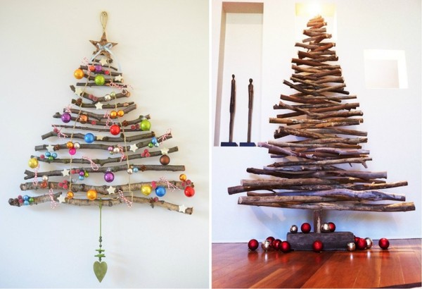 А вот эта елка подойдет для оформления загородного дома. Веточки можно купить в магазине или найти в ближайшем лесу. Для начала нужно отобрать их по размеру, почистить при необходимости и если надо распилить на нужные детали. А затем можно приступать к процессу сборки елки-красавицы. Наряжать елку можно обычными игрушками или вообще не наряжать. Крепить такую красавицу модно на стене или соорудить настоящую елочку.