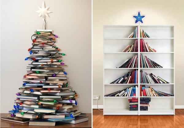 Елку из книг можно соорудить прямо на полу или расставить в форме елочки на полке. Украсить можно так же игрушками и гирляндами. И что самое главное, оставить ее можно на целый год, после чего остается вытирать своевременно пыль :-)