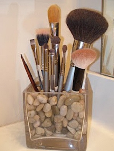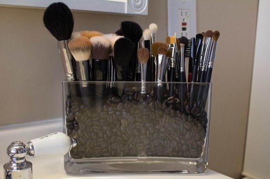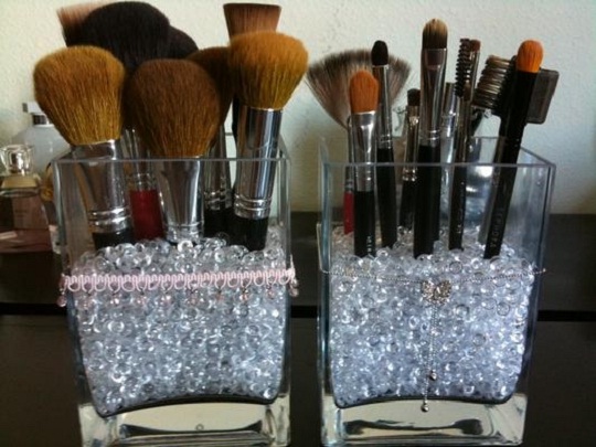 В качестве идеи для хранения косметики стоит обратить внимание на прозрачные стаканы, потому что в них очень удобно держать кисти для макияжа. А если заполнить их черными бобами или морской солью, то так кисти всегда будут стоять ровно.