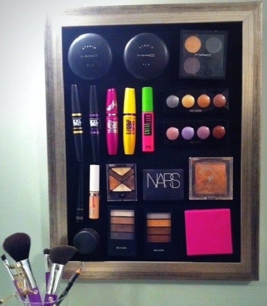 Возможно, вы это уже видели, но все равно хотелось бы обратить ваше внимание, это доска для косметики, которая легко делается своими руками. Весь секрет такой доски в том, что она магнитная в результате чего на ней просто крепятся коробки где будет храниться косметика и прочие необходимые принадлежности.