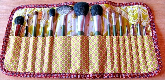 Они удобны еще и тем, что их покупать не обязательно. Их легко сшить своими руками, для этого подбираем ткань и цвет. Сшиваем ее по форме кармашка и прошиваем необходимое количество отсеков для карандашей, туши и кистей.