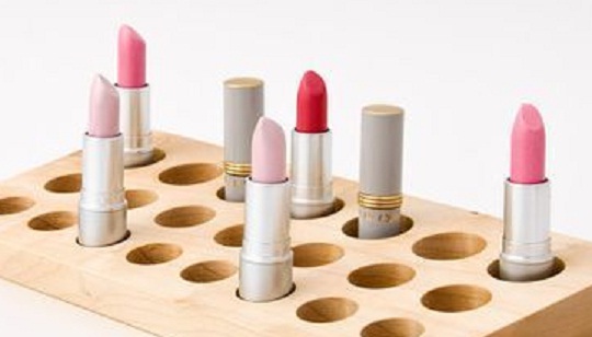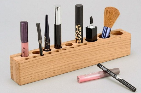 Так очень удобно организовать хранение помады в обычном куске дерева, достаточно высверлить в нем разного диаметра отверстия.