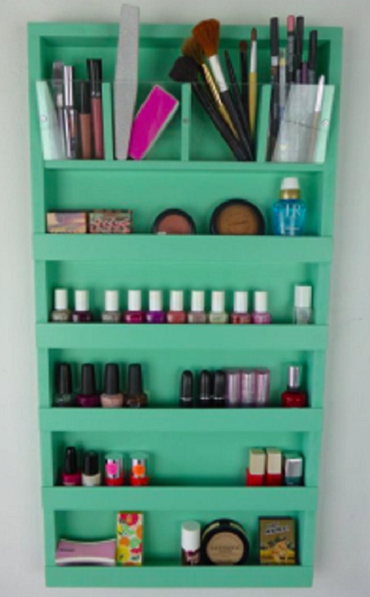 Полочки для хранения специй также можно использовать не только по их прямому назначению. Например, такой стенд можно применить для хранения лака для ногтей. На таких полочках все бутылочки будут на виду, в результате их можно выставить по оттенкам. Стойку красим в цвет, который будет гармонировать с интерьером помещения. Теперь смело вешаем на стену!