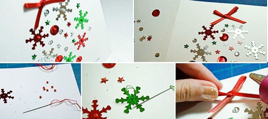 Для изготовления такой открытки необходимо подготовить пайетки различных размеров и форм, нитки, иголку, ленту для декорирования и клей.