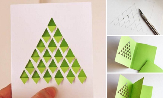 Для любителей порядка и строгого контроля, станет отличным вариантом новогодняя открытка своими руками с геометрической елочкой. Шедевр такого типа легко и быстро можно изготовить, если заранее подготовить: плотную бумагу для основы, карандаш и линейку, канцелярский нож, двусторонний скотч или клей ПВА.