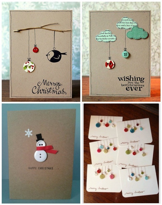 Каждый дом индивидуален, но в любом найдется пыльная коробка, в которой хранятся самые разные пуговицы. Так вот наступило и их время, смело доставайте, они нам очень пригодятся. С их помощью можно сделать нарядные открытки. Можно, например, сообразить елочные игрушки и пуговичного снеговичка.