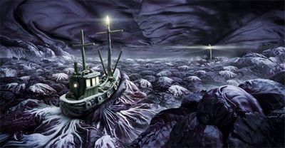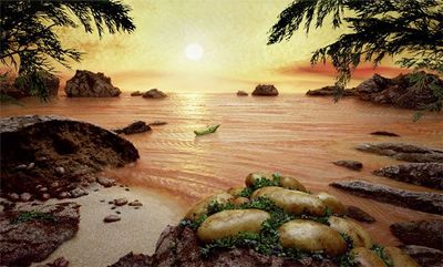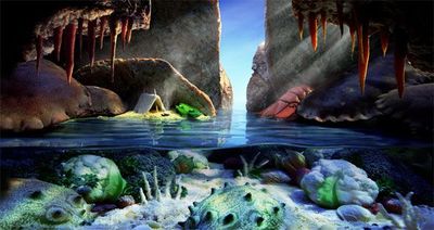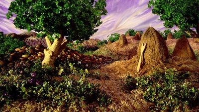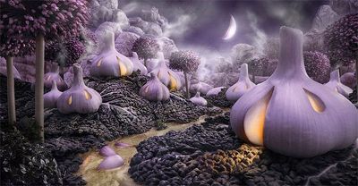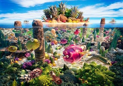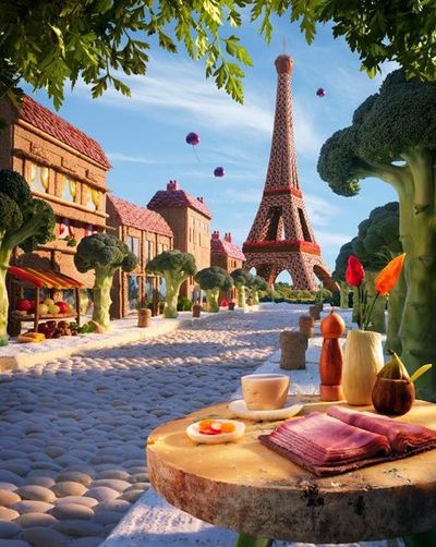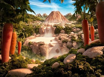 Все дело в том, что Карл Уорнер, иллюстратор по образованию, мастер жанра с его подачи известного как «Foodscapes», то есть пейзажи из еды. На его картинах горы сделаны из хлеба, деревья — это брокколи, волны — листы капусты, а роль камней исполняет печеный картофель.