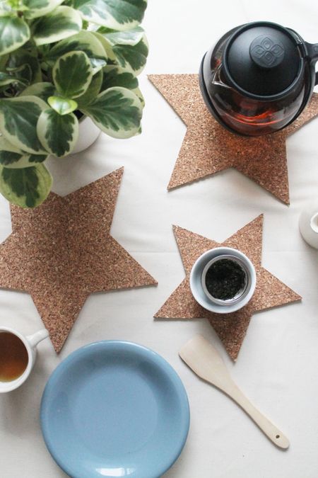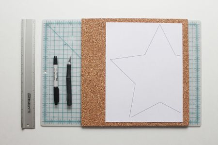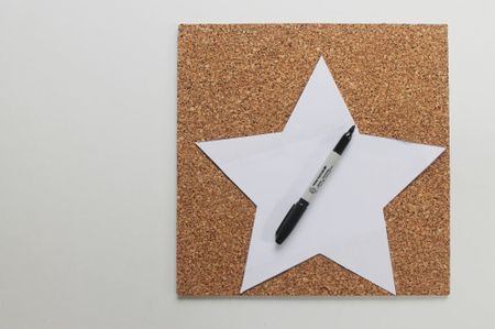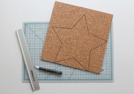 Шаблон для поставки вы можете придумать любой — у меня звездочка. Нарисуйте его предварительно на листе бумаги и затем перенесите на пробковый слой.
