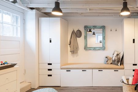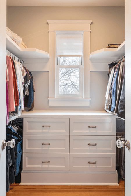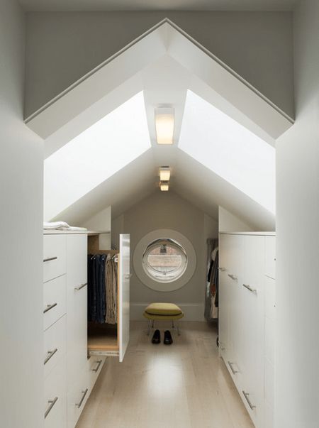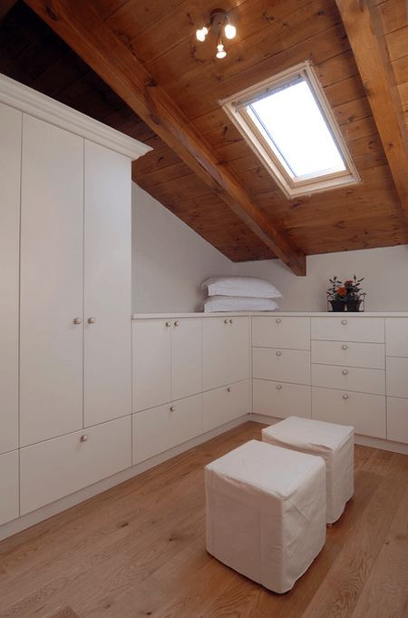Превратите грязный и заброшенный чердак частного дома в невероятную белоснежную гардеробную! В пространстве с большим скосом потолка и непростой архитектурой непросто обустроить функциональную комнату. Но для систем хранения это место подходит идеально. Пространство с наибольшей высотой потолка оставьте для прохода, в зонах, где вы не смогли бы поместиться в полный рост, обустройте системы хранения – шкафчики и ящики, вешала и выдвижные боксы.