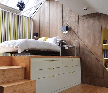 А следующий вариант обустройства нескольких выдвижных ящиков связан уже с использованием свободного пространства под помостом, на котором находится кровать. Было бы непростительной оплошностью оставить без рациональной эксплуатации такое количество полезного пространства.